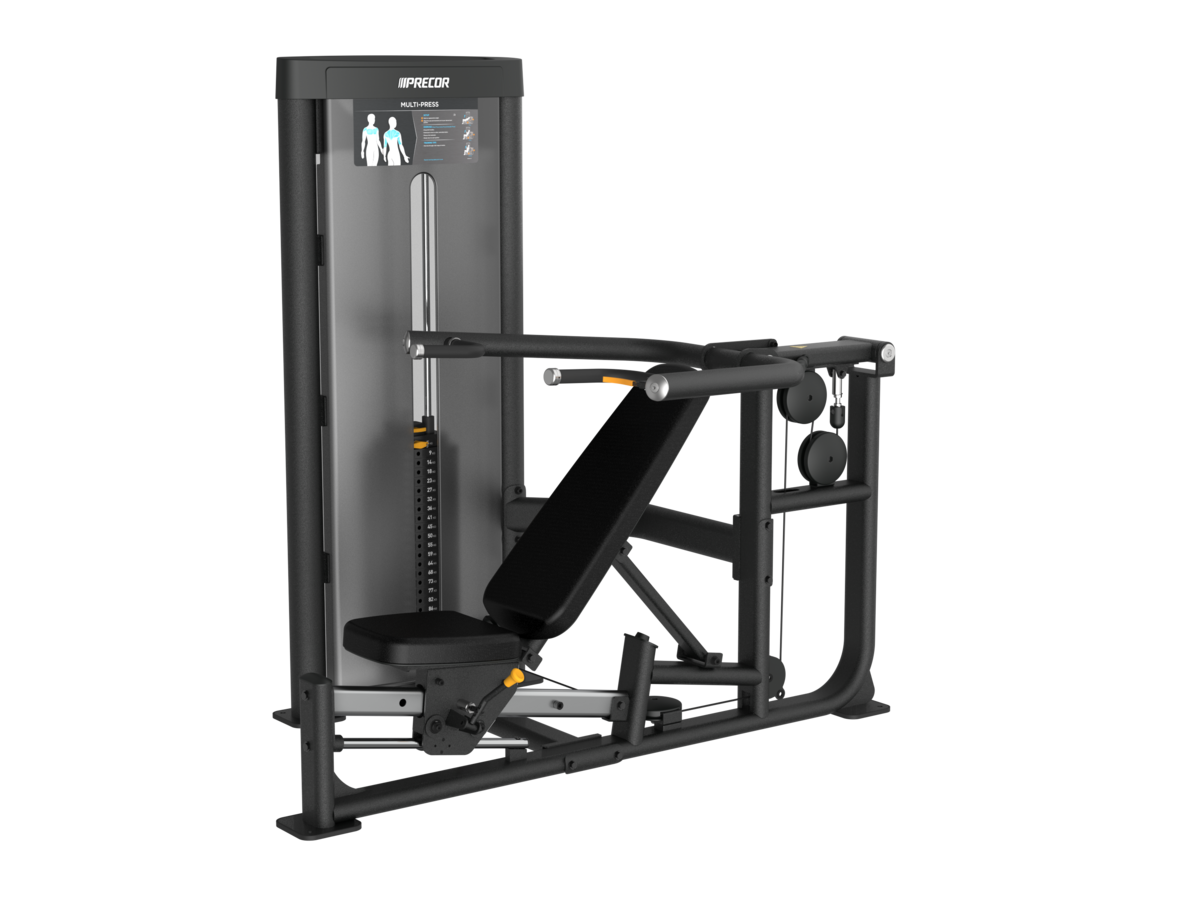 Le Vitality Multi-Press regroupe trois machines en une : développé couché, développé incliné et développé épaule. Les utilisateurs peuvent ajuster le bras de poussée et le siège directement sur la machine pour adopter la bonne position et la posture correcte. Ils peuvent facilement ajouter du poids supplémentaire grâce à un simple levier pour augmenter la charge de travail.